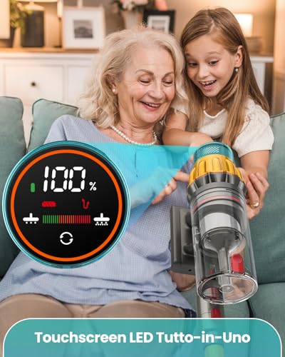 Un elemento che distingue questo modello è il suo display touch LED a colori. Questo schermo non è un semplice vezzo estetico, ma uno strumento utile che fornisce informazioni in tempo reale sul livello di carica della batteria, sulla modalità di aspirazione selezionata e su eventuali necessità di manutenzione, come la pulizia del filtro o la presenza di ostruzioni. Avere tutto sotto controllo con un semplice sguardo rende l'esperienza d'uso più intuitiva e piacevole.