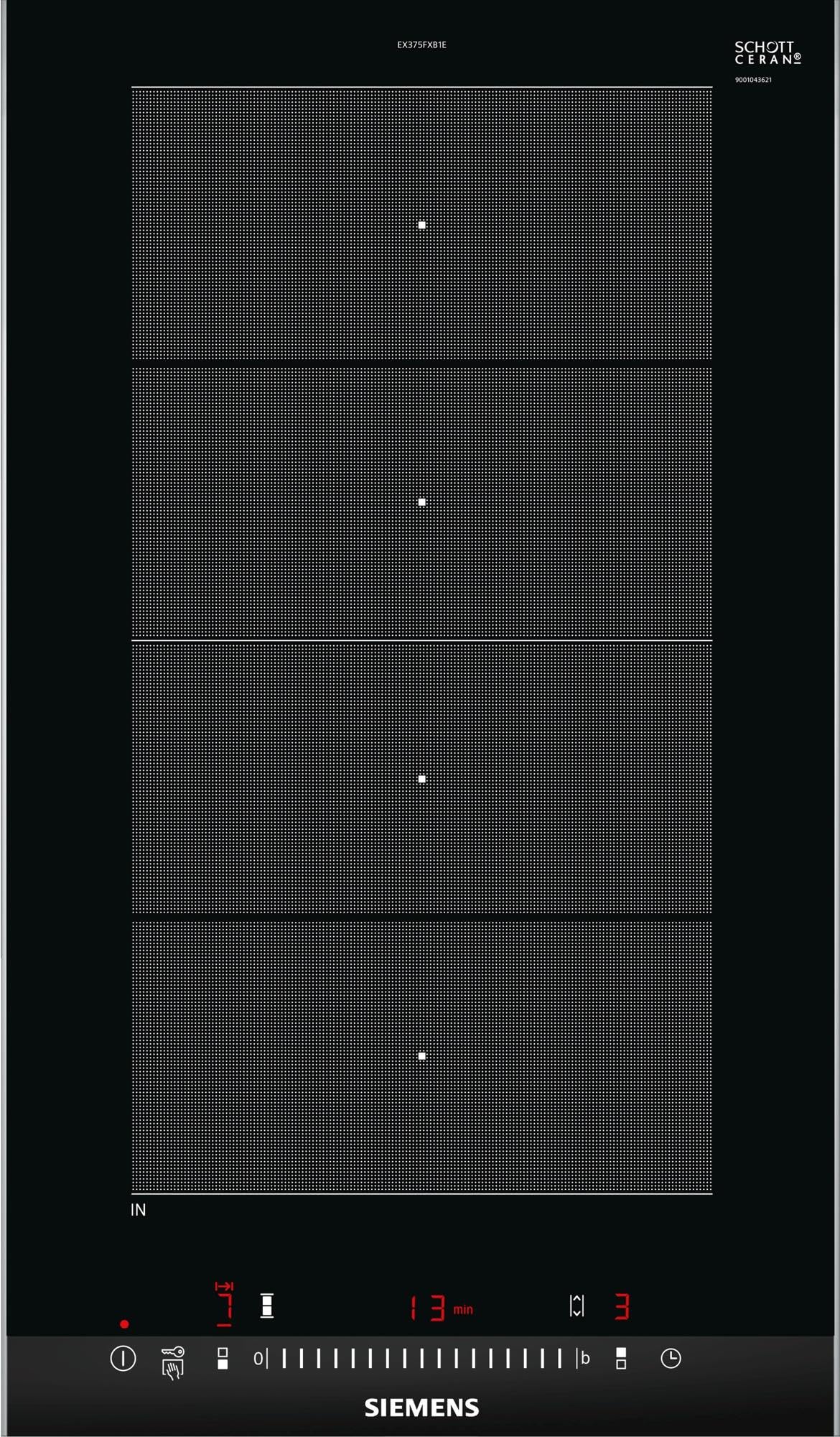 Il Siemens EX375FXB1E si presenta come un piano cottura a induzione di tipo "domino", largo appena 30 cm. Questa sua caratteristica lo rende ideale non solo per le cucine più piccole, dove lo spazio è prezioso, ma anche per chi desidera creare una zona cottura personalizzata, abbinandolo ad altri moduli domino (ad esempio un fuoco a gas o una piastra teppanyaki). L'estetica è quella tipica di Siemens: elegante, minimale e moderna. La superficie in vetroceramica nera con profili laterali in acciaio inox (finitura topClass) dona un tocco di classe a qualsiasi ambiente.