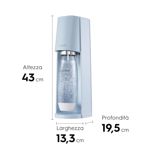 Appena tolto dalla scatola, il SodaStream Terra si presenta con un design moderno e compatto, disponibile in diverse colorazioni per adattarsi a ogni cucina. Le sue dimensioni contenute (altezza 43 cm, profondità 19,5 cm, larghezza 13,3 cm) gli permettono di trovare facilmente posto sul piano di lavoro senza ingombrare. La cosa che salta subito all'occhio è che non necessita di corrente elettrica per funzionare, un dettaglio non da poco che aumenta la sua versatilità e praticità.