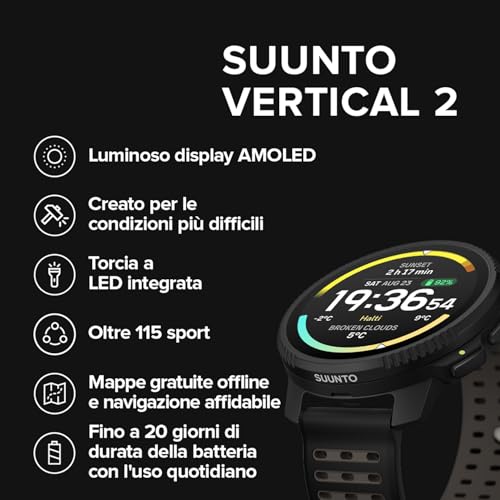 Il SUUNTO Vertical 2 è un'evoluzione matura e convincente, che riesce a colmare le lacune del passato e a proporsi come un serissimo contendente nel mercato degli orologi per l'avventura di alta gamma. L'introduzione del display AMOLED è una svolta che migliora drasticamente l'usabilità senza sacrificare l'incredibile autonomia, vero marchio di fabbrica di Suunto. La precisione del GPS, la robustezza costruttiva e le eccellenti capacità di navigazione con mappe offline lo rendono il compagno ideale per trail runner, alpinisti, escursionisti e chiunque ami esplorare gli ambienti più selvaggi. Sebbene manchi di alcune funzionalità "smart" come i pagamenti contactless o la musica integrata, la sua essenza è pura e focalizzata sulla performance outdoor. Se cercate un orologio affidabile, potente e quasi instancabile per le vostre avventure, il Vertical 2 è una scelta che non vi deluderà.