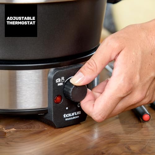 Il cuore pulsante di questo apparecchio è la sua potenza di 1000W, che si traduce in un riscaldamento rapido ed efficiente. Che tu stia sciogliendo delicato cioccolato o portando a temperatura l'olio per una bourguignonne, il tempo di attesa è davvero ridotto. La vera chicca, però, è il termostato regolabile. Questa funzione permette di impostare e mantenere con precisione la temperatura ideale per ogni tipo di preparazione, fino a un massimo di 200°C per l'olio e 99°C per l'acqua. Dimentica il formaggio che si brucia sul fondo o l'olio che smette di sfrigolare: con la Taurus il controllo è totale.