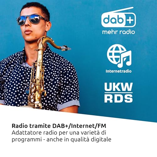 - Radio DAB+ e FM: Il sintonizzatore digitale DAB+ garantisce una ricezione perfetta, senza fruscii e con una qualità audio cristallina. La ricerca delle stazioni è rapida e semplice. Anche la classica radio FM è presente, per non perdere nessuna delle proprie emittenti preferite.