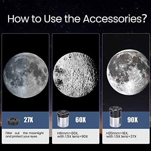 Utilizzando l'oculare H20mm (che fornisce 18 ingrandimenti), la visione della Luna è piacevole. Si riescono a distinguere i crateri più grandi e le principali "mari" lunari con una discreta chiarezza. Le cose cambiano quando si passa all'oculare H6mm (60 ingrandimenti) e si aggiunge la lente di Barlow 1.5x per raggiungere i famosi 90 ingrandimenti. A questo livello, l'immagine perde molta luminosità e nitidezza. Il cosiddetto "zoom 90X HD" è più una trovata di marketing che una reale capacità dello strumento. È tecnicamente possibile raggiungere tale ingrandimento, ma la qualità dell'immagine si degrada notevolmente, rendendo l'osservazione poco soddisfacente. Per un principiante, questo può essere fonte di frustrazione.