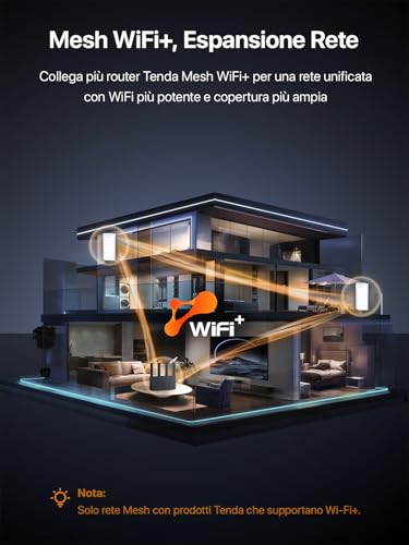 Un'altra funzione degna di nota è la compatibilità con la tecnologia Mesh Wi-Fi+. Questo significa che è possibile abbinare il router ad altri dispositivi Tenda compatibili per creare una rete Wi-Fi unificata e senza interruzioni, ideale per coprire abitazioni di grandi dimensioni o su più piani, eliminando le fastidiose "zone morte".