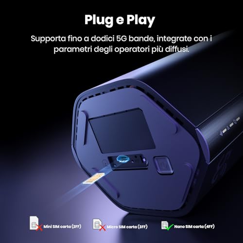 La configurazione è pensata per essere il più semplice possibile, grazie al sistema Plug & Play. Basta inserire una Nano SIM di qualsiasi operatore (ricordandosi di disattivare il PIN), collegare l'alimentatore e accendere il router. In pochi istanti, il dispositivo sarà pronto a fornire una connessione internet potente e stabile. Il router supporta ben dodici bande 5G e 4G, garantendo un'ampia compatibilità e una copertura del segnale significativa.