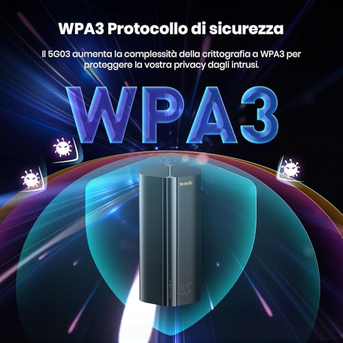 Sul fronte della sicurezza, il Tenda 5G03 integra lo standard di crittografia WPA3, che offre una protezione superiore rispetto ai precedenti standard, mettendo al riparo la tua rete da accessi non autorizzati. A livello di connettività cablata, il router dispone di due porte Gigabit Ethernet, utili per collegare dispositivi come PC fissi, console di gioco o smart TV e sfruttare al massimo la velocità della connessione.