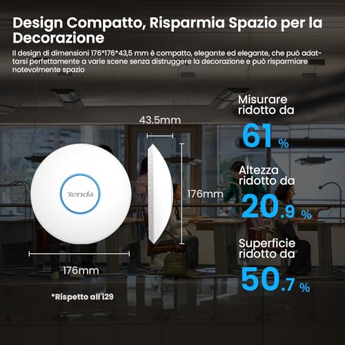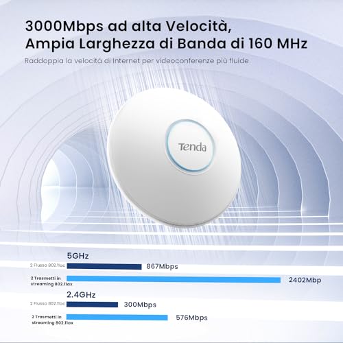Il Tenda I27 è un access point (AP) da soffitto o da parete che promette di portare la rivoluzione del Wi-Fi 6 (802.11ax) in ambienti domestici e professionali di medie e grandi dimensioni. A differenza di un comune router, un access point si collega via cavo a una rete esistente per creare una nuova rete wireless o estendere quella già presente, garantendo prestazioni superiori in termini di velocità, copertura e gestione di più dispositivi connessi contemporaneamente. Questo prodotto si rivolge a chiunque abbia bisogno di una rete Wi-Fi veramente performante: dalle famiglie numerose con tanti dispositivi connessi (PC, smartphone, smart TV, console), agli uffici, hotel o piccoli esercizi commerciali dove una connessione stabile è fondamentale per l'attività lavorativa.