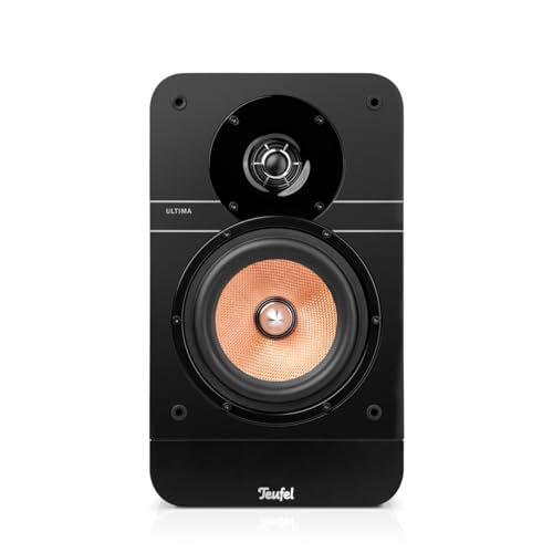 Appena estratti dalla confezione, i Teufel ULTIMA 25 AKTIV colpiscono per le loro dimensioni, non esattamente compatte ma nemmeno ingombranti. Con un'altezza di 36,5 cm e una larghezza di 21,5 cm, sono diffusori da scaffale di medie dimensioni che richiedono un certo spazio. Il design è quello iconico della serie Ultima, con il caratteristico driver midrange color rame in fibra di vetro che spicca sulla parte frontale nera. La costruzione è solida e trasmette una sensazione di grande robustezza, come da tradizione Teufel. L'altoparlante principale (master), che ospita tutta l'elettronica e le connessioni, pesa 8,5 kg, mentre il satellite passivo si ferma a 6 kg.