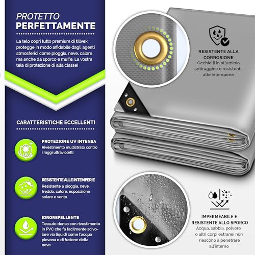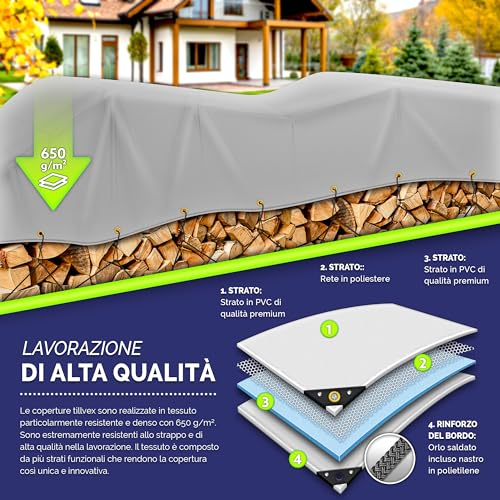 Il cuore di questo prodotto è senza dubbio il suo materiale. Il PVC da 650 g/m² non è solo pesante, ma è anche trattato per resistere a una vasta gamma di agenti esterni. È completamente impermeabile, una caratteristica fondamentale per proteggere qualsiasi cosa dalla pioggia, dalla neve e dall'umidità. Inoltre, è dichiarato resistente ai raggi UV, un dettaglio non da poco che previene lo sbiadimento e il deterioramento del materiale se esposto al sole per lunghi periodi.