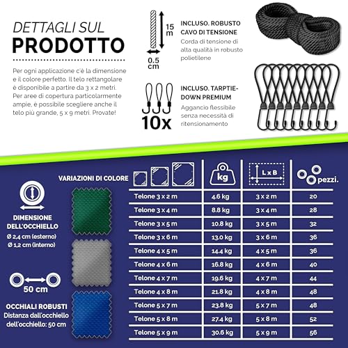 - Kit di fissaggio completo: La presenza di elastici e corda è un valore aggiunto che permette di utilizzare il telo immediatamente e in modo efficace.