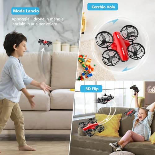 Non mancano le acrobazie! Con la pressione di un tasto, il Tomzon A24 può eseguire flip a 360 gradi, rotazioni ad alta velocità e persino volare in cerchio, aggiungendo un tocco di spettacolarità al volo. C'è anche la simpatica funzione "Toss to Fly" (lancia per volare): basta lanciare delicatamente il drone in aria e lui si accenderà e si stabilizzerà da solo, pronto per essere pilotato.