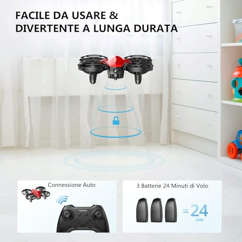 Una delle qualità più apprezzate di questo mini drone è senza dubbio la sua estrema facilità di utilizzo. Non serve essere piloti esperti per divertirsi con il Tomzon A24. Grazie a funzioni come il decollo e l'atterraggio automatici con un singolo tasto, anche i principianti assoluti possono far librare il drone in aria in pochi secondi. A questo si aggiunge la funzione di mantenimento dell'altitudine (Altitude Hold), che permette al drone di rimanere stabile in aria senza dover continuamente agire sulla levetta del gas. Questo rende il controllo molto più semplice e intuitivo.