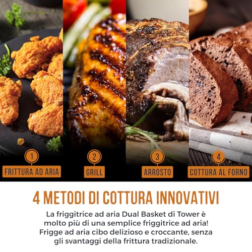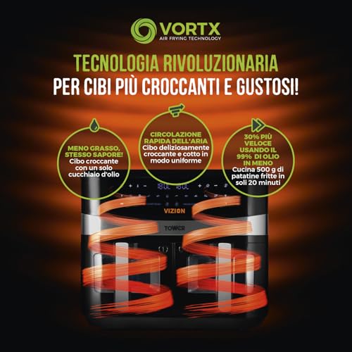 Il cuore pulsante della TOWER T17088 è la tecnologia Vortx. Questo sistema esclusivo fa circolare l'aria calda a grande velocità all'interno dei cestelli, garantendo una cottura uniforme e croccante con un utilizzo minimo o nullo di olio. Il risultato? Cibi che sembrano fritti ma con fino al 99% di grassi in meno. Un bel vantaggio per chi tiene alla linea ma non vuole rinunciare al gusto!