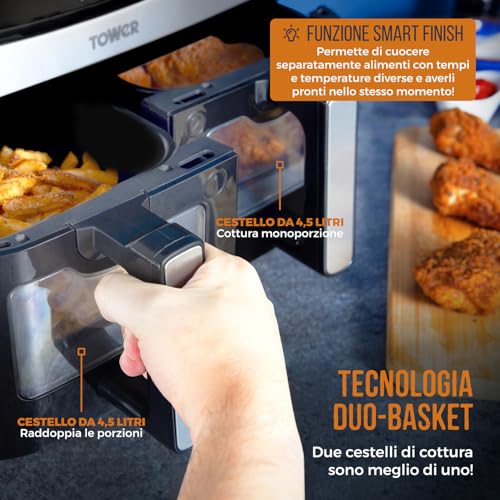 La prima cosa che salta all'occhio è senza dubbio il suo design: moderna ed elegante, si adatta bene a qualsiasi tipo di cucina. Ma è sotto la scocca che si nasconde la vera magia. Con i suoi due cestelli indipendenti da 4,5 litri ciascuno, per una capacità totale di ben 9 litri, questa friggitrice è pensata per le famiglie numerose o per chi ama organizzare cene con gli amici. Poter cucinare due pietanze diverse contemporaneamente, con tempi e temperature differenti, è una vera e propria svolta.