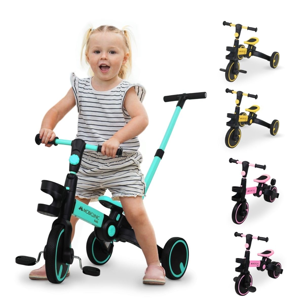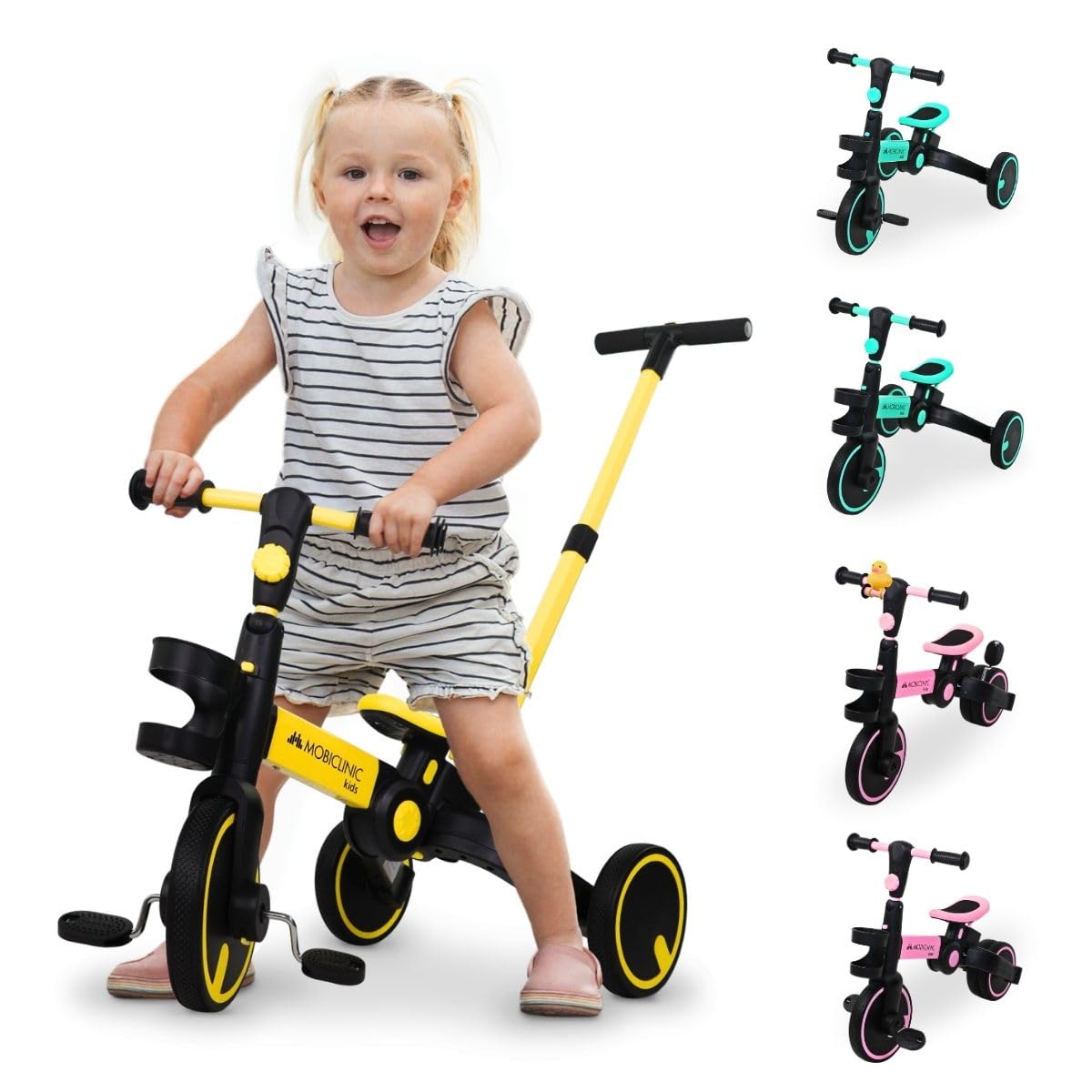 - Modalità 2 e 3: Triciclo autonomo. Rimuovendo il maniglione, il bambino può iniziare a pedalare in autonomia. I pedali sono facilmente removibili con un clic, trasformando il triciclo in una sorta di "push bike" a tre ruote, perfetta per prendere confidenza con la spinta dei piedi.