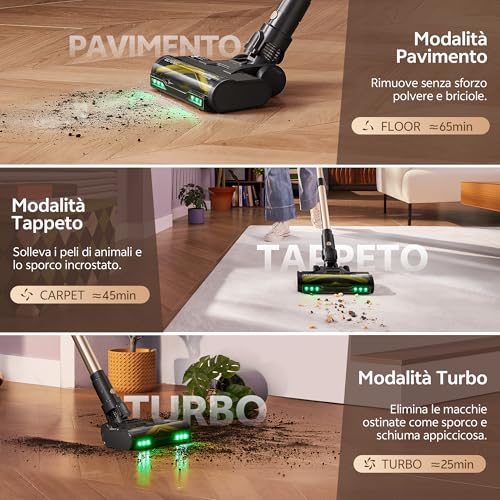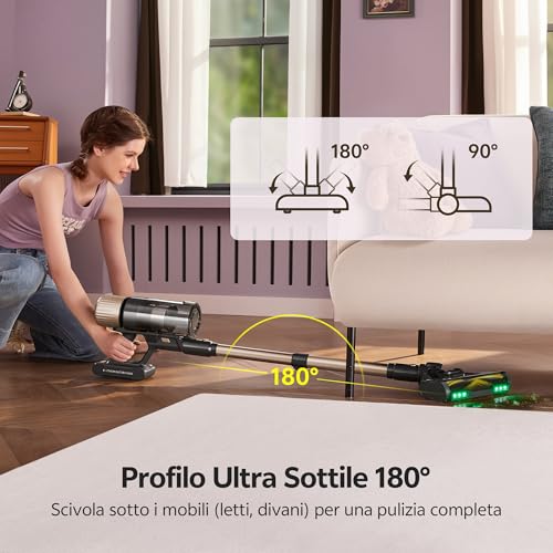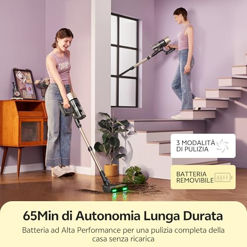 Una delle caratteristiche più innovative di questo aspirapolvere Ultenic è la tecnologia GreenEye™. Si tratta di una luce LED verde posizionata sulla spazzola principale che ha lo scopo di evidenziare la polvere e lo sporco più fine, altrimenti invisibile a occhio nudo. Questa funzione si rivela sorprendentemente utile, soprattutto in condizioni di scarsa illuminazione o per chi è particolarmente attento alla pulizia, permettendo di non tralasciare nemmeno un granello di polvere.
