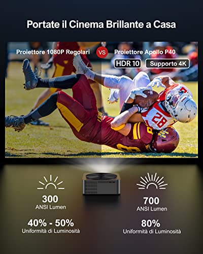 Parliamo del punto cruciale: come si vede? L'Apollo P40 vanta una risoluzione nativa Full HD 1080P (1920x1080 pixel), ma è in grado di decodificare e riprodurre contenuti in 4K. Questo significa che, pur non proiettando un'immagine 4K nativa, può accettare un segnale di qualità superiore e scalarlo, garantendo una maggiore ricchezza di dettagli rispetto a un segnale 1080p standard.