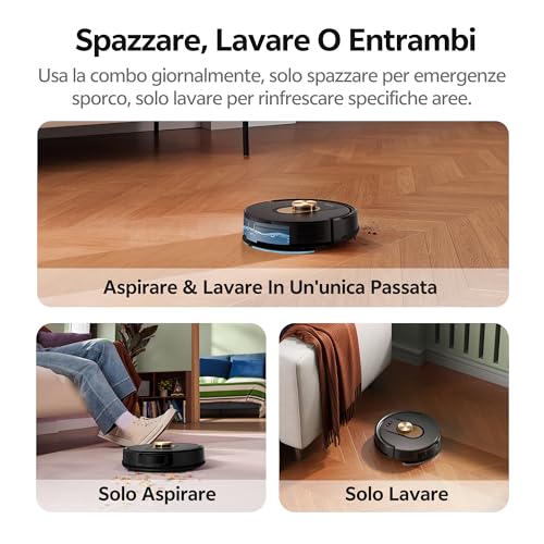 Per quanto riguarda la funzione di lavaggio, è importante essere realistici. Come per la maggior parte dei robot 2-in-1, non si tratta di un lavaggio profondo in grado di rimuovere macchie ostinate e incrostate. Tuttavia, si rivela molto utile per rinfrescare i pavimenti e rimuovere quello strato sottile di polvere che l'aspirazione da sola non riesce a catturare. L'applicazione permette di regolare il flusso d'acqua su diversi livelli, per adattare l'umidità del panno al tipo di pavimento.