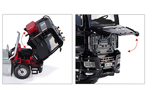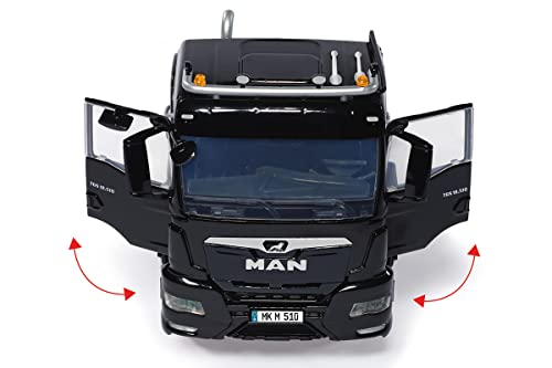 Ma le sorprese non finiscono qui. La griglia del radiatore anteriore può essere sollevata, mostrando le componenti meccaniche sottostanti. L'intera cabina è inclinabile, proprio come nel camion reale, per dare accesso a una riproduzione dettagliata del potente motore MAN. L'asse anteriore è sterzante, permettendo di posizionare il modello in modo dinamico. Persino dettagli come gli specchietti retrovisori, le trombe cromate sul tetto, i tergicristalli e l'aletta parasole sono realizzati con una cura impressionante.