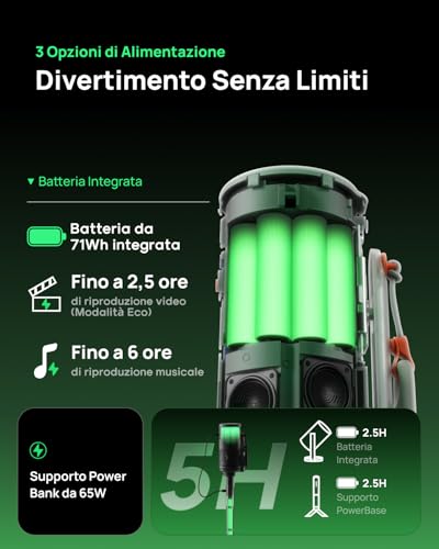 Una delle differenze più significative rispetto ai modelli precedenti è la rimozione della batteria integrata. Questa scelta, se da un lato ha permesso di migliorare altri comparti come l'audio, dall'altro ne limita la portabilità "estrema". Per funzionare, il MoGo 2 Pro necessita sempre di una fonte di alimentazione. La buona notizia è che, oltre al suo alimentatore, può essere alimentato tramite la porta USB-C da un power bank compatibile (con uscita da almeno 65W), mantenendo così una buona dose di flessibilità.