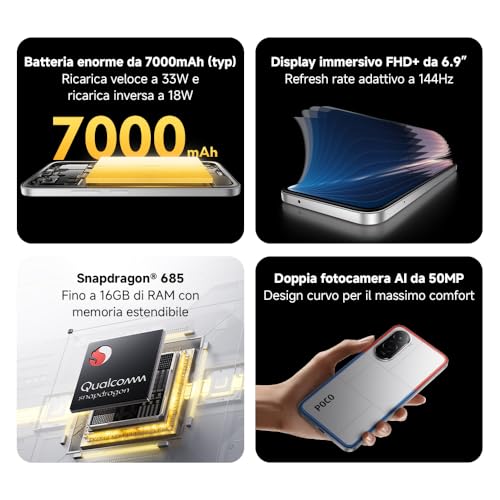 Supporta la ricarica rapida a 33W, che permette di ricaricare la capiente batteria in tempi ragionevoli. Inoltre, è presente la funzionalità di ricarica inversa da 18W, che consente di utilizzare il POCO M7 come un power bank per caricare altri dispositivi.