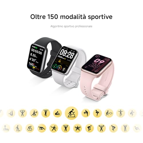 Le dimensioni sono di 43,27 x 32,49 x 10,8 mm con un peso di soli 24,5 grammi (escluso il cinturino), rendendola estremamente comoda da indossare giorno e notte senza alcun fastidio. L'assenza di pulsanti fisici, con tutte le interazioni affidate a gesti touch sullo schermo, contribuisce a un look pulito e minimale.