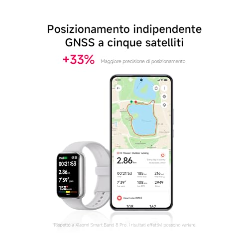 La Xiaomi Smart Band 9 Pro è un vero e proprio compagno per il benessere e l'attività fisica. Il fiore all'occhiello è senza dubbio il GPS integrato (con supporto a GNSS, BeiDou, GLONASS, Galileo e QZSS), che permette di tracciare con precisione percorsi e allenamenti all'aperto senza doversi portare dietro lo smartphone. Questa è la differenza principale rispetto al modello standard e un grande vantaggio per i runner e i ciclisti.