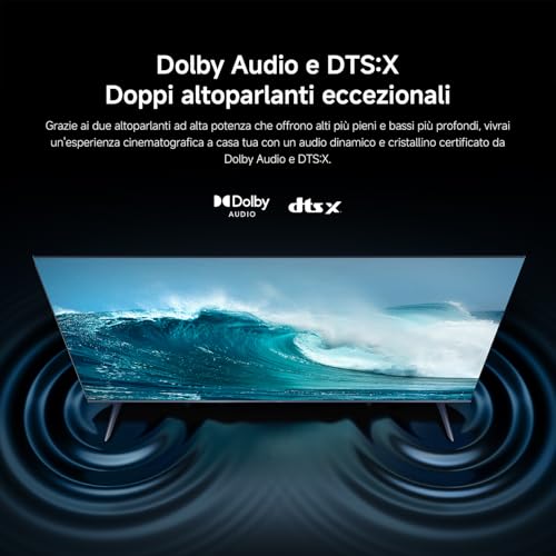 Il comparto audio è composto da due speaker da 10W ciascuno, per un totale di 20W. È presente il supporto a Dolby Audio, DTS:X e DTS Virtual:X, tecnologie che mirano a creare un suono più immersivo. Nell'uso quotidiano, l'audio risulta sufficiente e chiaro per la visione di programmi TV e dialoghi. Tuttavia, come spesso accade con i televisori in questa fascia di prezzo, per un'esperienza davvero cinematografica o per godere appieno di colonne sonore complesse, l'abbinamento con una soundbar esterna è caldamente consigliato.
