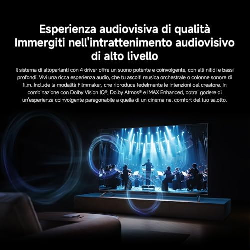 Sul fronte audio, lo XIAOMI TV S Mini LED sorprende positivamente. Nonostante lo spessore ridotto del pannello, i due altoparlanti da 12.5W riescono a restituire un suono chiaro e bilanciato. Il supporto a Dolby Atmos e DTS:X crea un effetto surround virtuale coinvolgente, che migliora notevolmente l'esperienza durante la visione di film e serie TV. Certo, per un'esperienza da vero cinema in casa una soundbar dedicata rimane la scelta migliore, ma l'audio integrato è decisamente superiore alla media della sua categoria.
