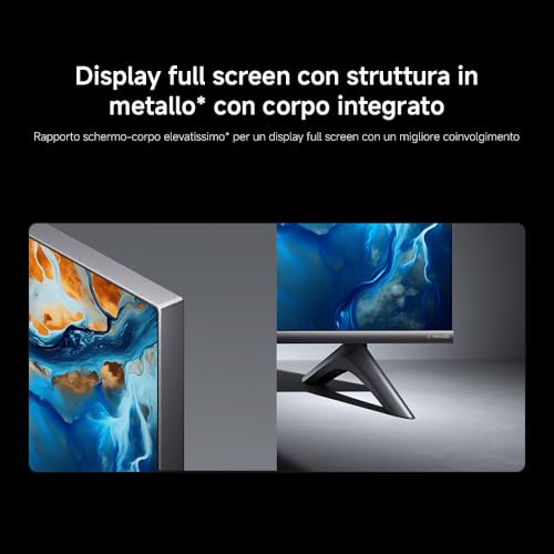 Il design è un altro aspetto curato da Xiaomi. La TV presenta un telaio in metallo con cornici ultrasottili, che massimizzano il rapporto schermo-corpo e favoriscono l'immersione visiva. L'estetica è moderna ed elegante, capace di adattarsi a qualsiasi tipo di arredamento.
