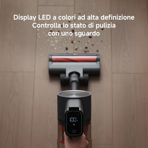 Sul corpo motore spicca un display LED a colori, chiaro e intuitivo. Questo schermo fornisce informazioni in tempo reale sul livello di aspirazione selezionato e, cosa molto importante, sullo stato di carica della batteria, permettendo di gestire al meglio le sessioni di pulizia.