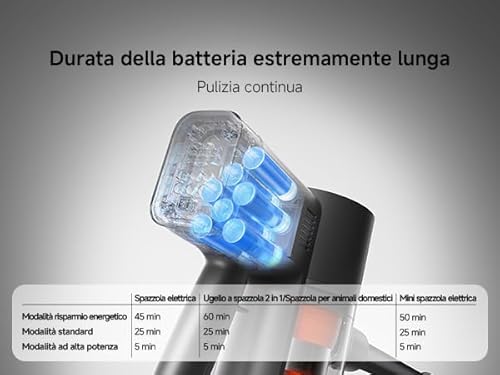 La batteria integrata a 7 celle promette un'autonomia fino a 60 minuti in modalità a risparmio energetico con gli accessori non motorizzati. Con la spazzola per pavimenti, questo valore scende a circa 45 minuti. Si tratta di un'autonomia buona, sufficiente per la pulizia di appartamenti di medie dimensioni. Tuttavia, il tallone d'Achille emerge quando si utilizza la modalità a massima potenza: l'autonomia crolla drasticamente a pochi minuti (circa 4-5), rendendola adatta solo per interventi rapidi e mirati.