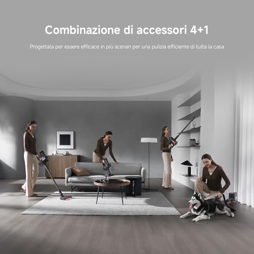 In termini di maneggevolezza, il peso complessivo di circa 4,2 kg potrebbe sembrare elevato, ma il peso che si percepisce in mano durante l'uso è inferiore, attestandosi intorno a 1,6 kg. Nonostante ciò, alcuni utenti lo hanno percepito come un po' pesante, specialmente nelle sessioni di pulizia più lunghe. Un altro piccolo difetto è l'impossibilità di stare in piedi da solo, richiedendo di essere appoggiato a una parete o riposto sulla sua base di ricarica a muro.