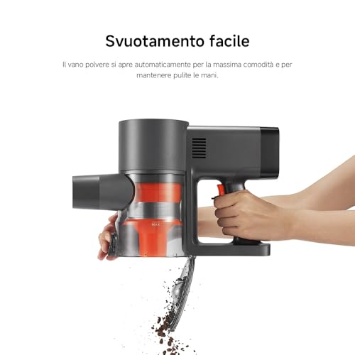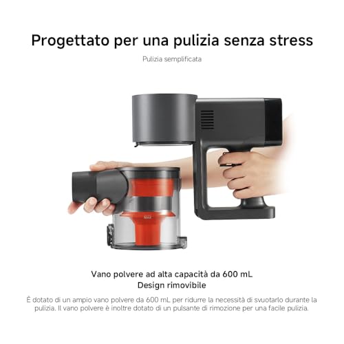 Il contenitore della polvere da 600 ml è capiente e facile da svuotare grazie a un comodo pulsante che ne permette l'apertura con un solo gesto, evitando il contatto diretto con lo sporco.