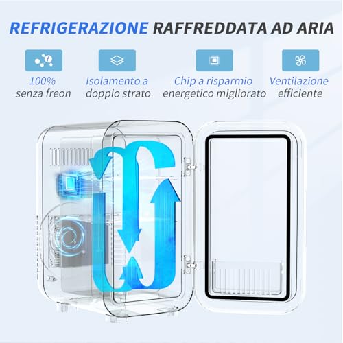 La qualità costruttiva generale è buona, la scocca in polipropilene appare solida e ben assemblata. All'interno, lo spazio da 6 litri è ottimizzato da un ripiano rimovibile, che permette di organizzare al meglio il contenuto. Può ospitare fino a 8 lattine da 330 ml, oppure una combinazione di snack, yogurt, frutta e, ovviamente, i tanto amati prodotti per la skincare.