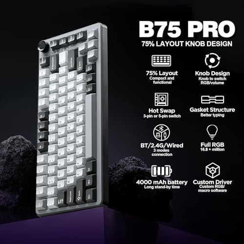 Il design della B75 PRO è pulito e moderno, disponibile in diverse colorazioni per adattarsi a ogni stile. La disposizione dei tasti, definita "exploded 75%", garantisce una spaziatura confortevole tra i vari blocchi di tasti, facilitando l'individuazione delle frecce e dei tasti di navigazione senza dover abbassare lo sguardo. I piedini regolabili su due livelli permettono di trovare l'angolazione di digitazione perfetta, mentre i gommini inferiori assicurano una stabilità eccellente su qualsiasi superficie.