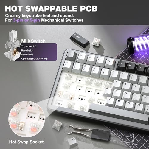 La tastiera è disponibile con diversi tipi di switch lineari e tattili pre-lubrificati di fabbrica, come i YUNZII Milk o i Cocoa Cream V2. Questa pre-lubrificazione assicura una corsa fluida e priva di attriti fin dal primo utilizzo. Inoltre, la scheda PCB è hot-swappable a 5 pin, il che significa che potrai sostituire gli switch in qualsiasi momento senza bisogno di saldature, personalizzando al massimo il feedback tattile e sonoro della tua tastiera. Anche gli stabilizzatori sono di ottima fattura e pre-lubrificati, garantendo una pressione uniforme sui tasti più grandi come la barra spaziatrice e l'invio.